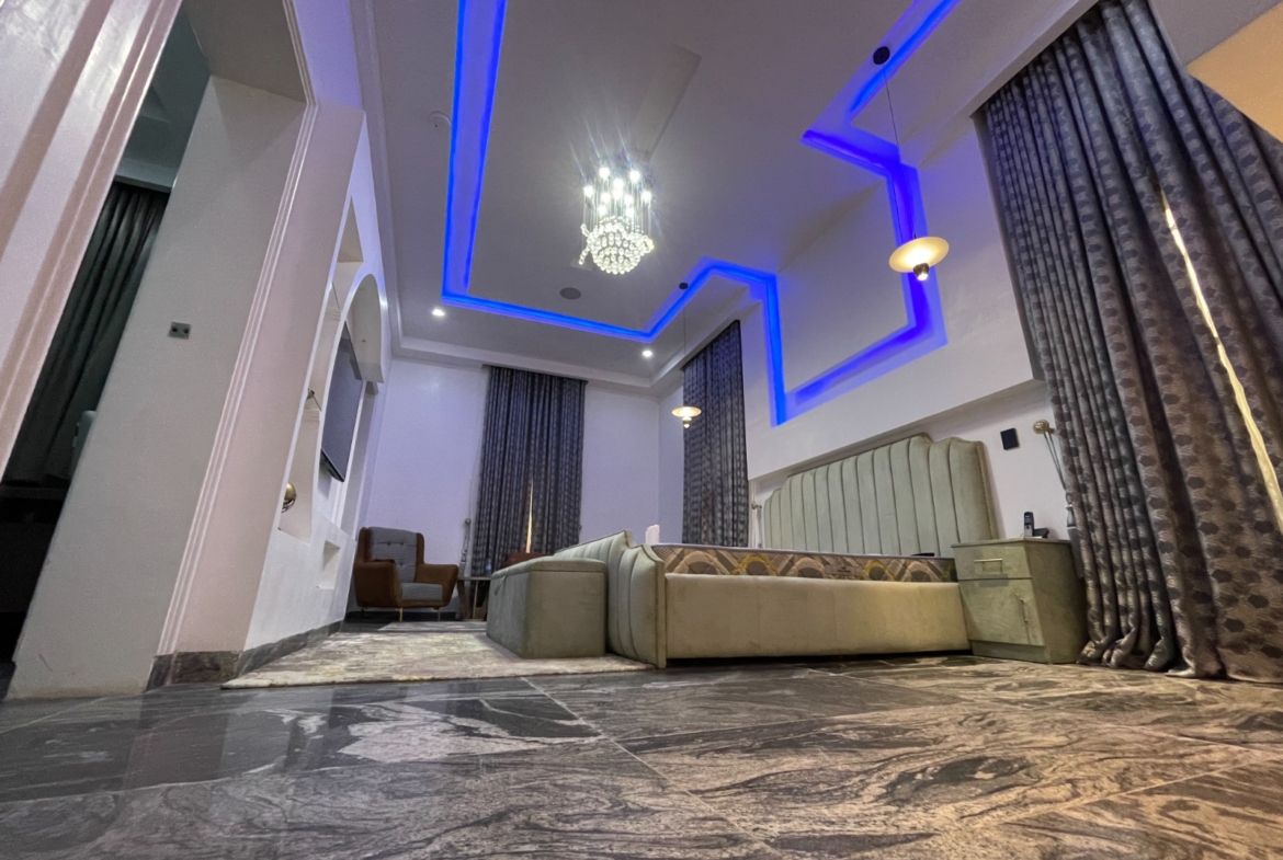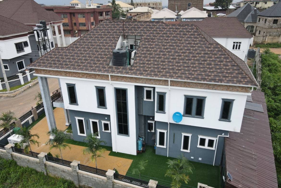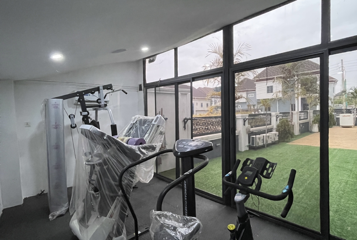 A carefully designed smart home in Ibadan most secured estate Tiger mini estate, with smart home gate features and gazebo for relaxation and gym room to keep fit, well finished and furnished. All room ensuite, 2 living room.